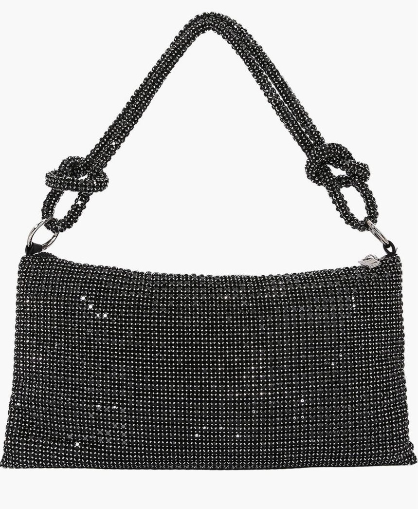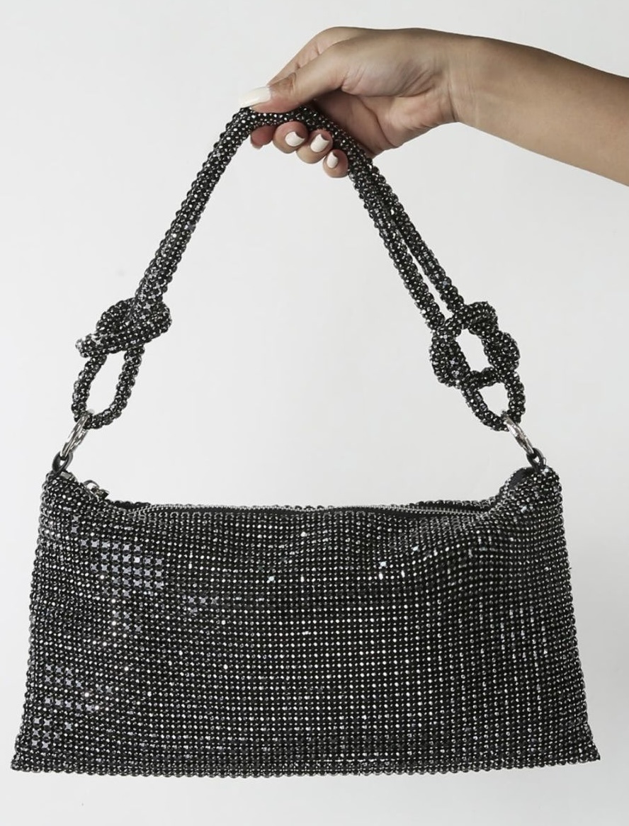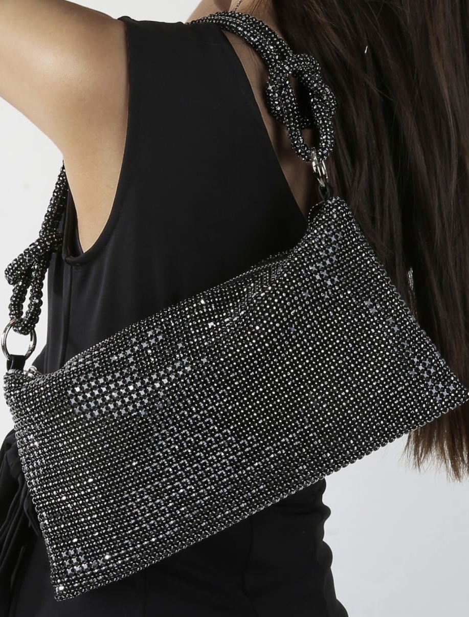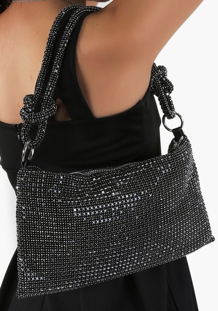 This going-out bag is perfect for a night out, with its diamante embellishments and double knot strap detail. The slouchy, effortless design fits all your essentials without compromising on style. Pair it with some diamante heels for a totally put-together look!