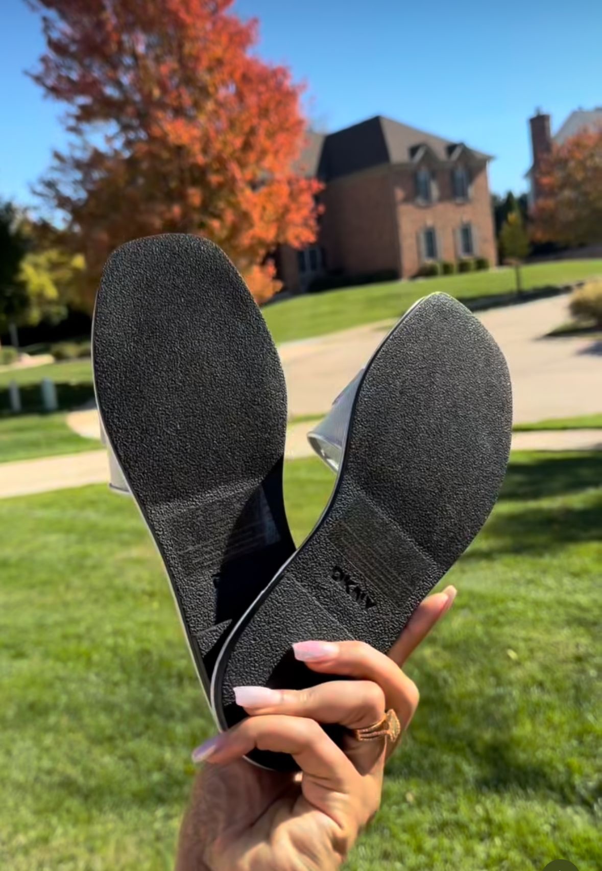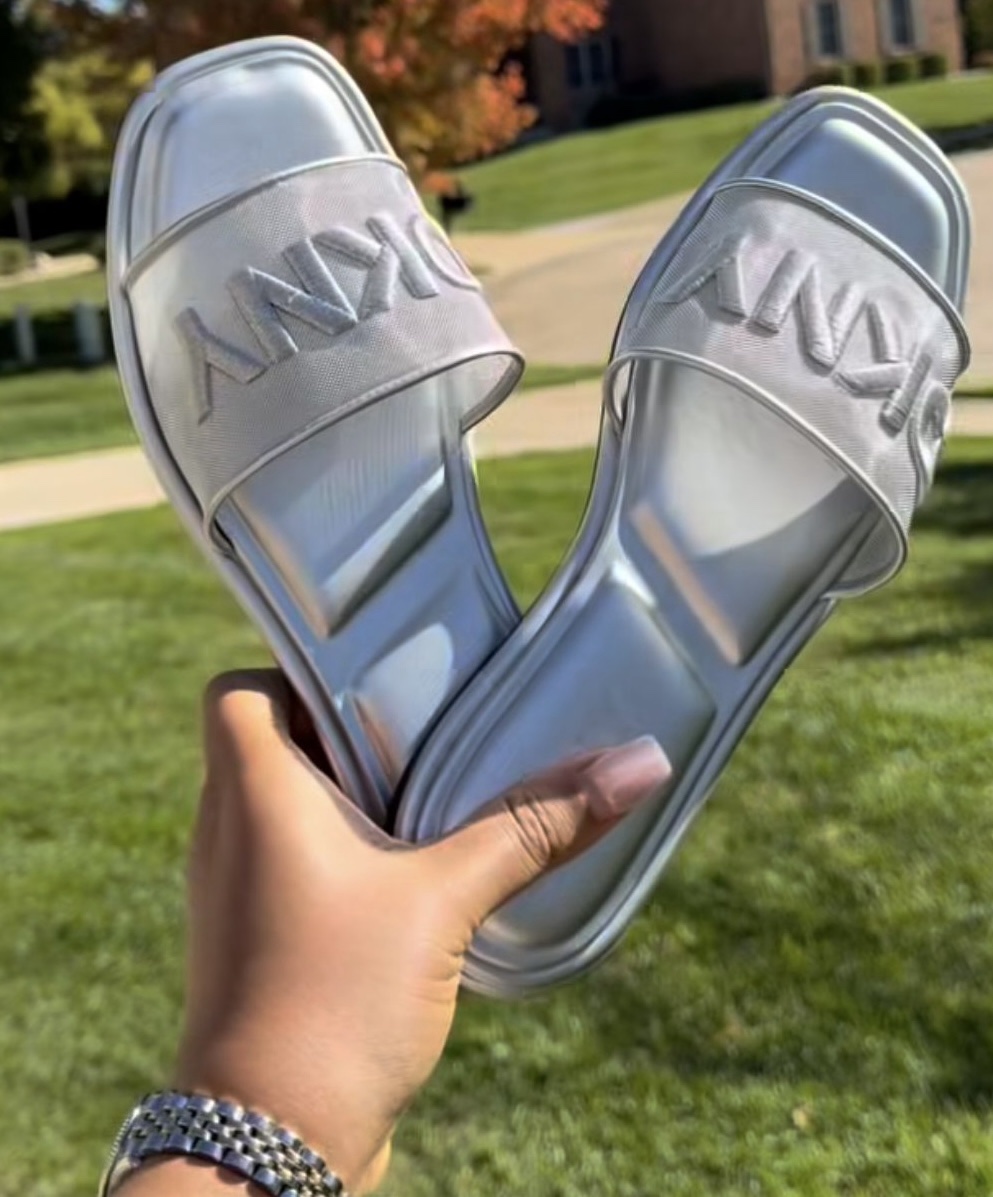 These stylish slip-on sandals feature an embroidered or embossed DKNY logo on the strap. The design includes a cushioned footbed for comfort, making them suitable for casual, everyday wear.