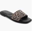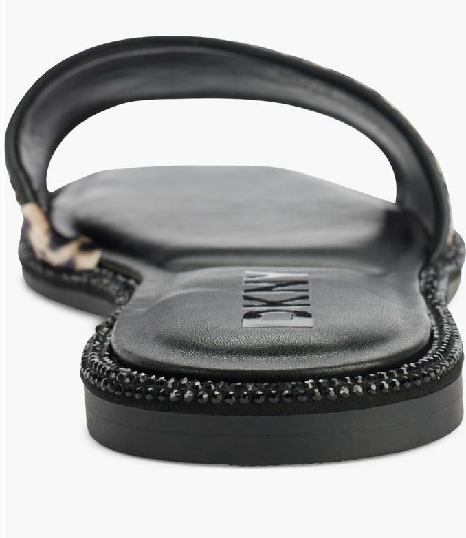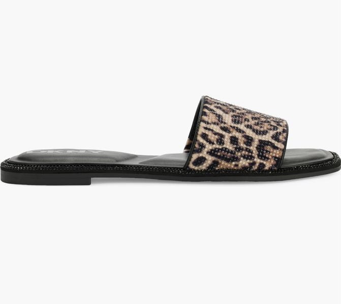 Elevate your everyday look with this lightly cushioned slide sandal featuring a sparkling leopard-spotted strap with rhinestone embellishments along the sole.
