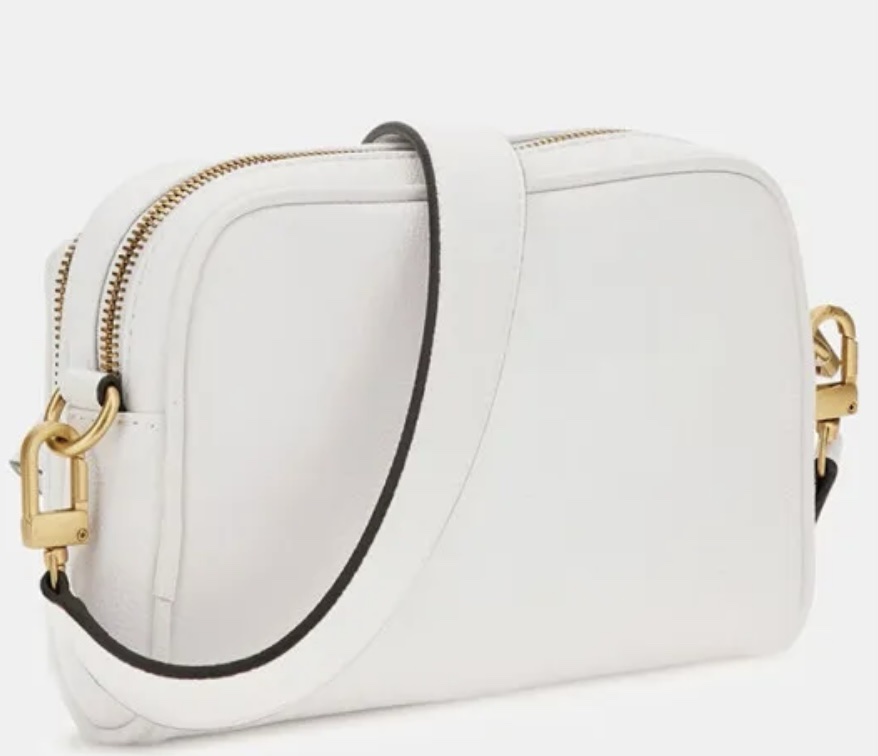 Bag styles feature a rectangular camera bag shape, a triangular metal logo on the front, and gold-tone hardware.