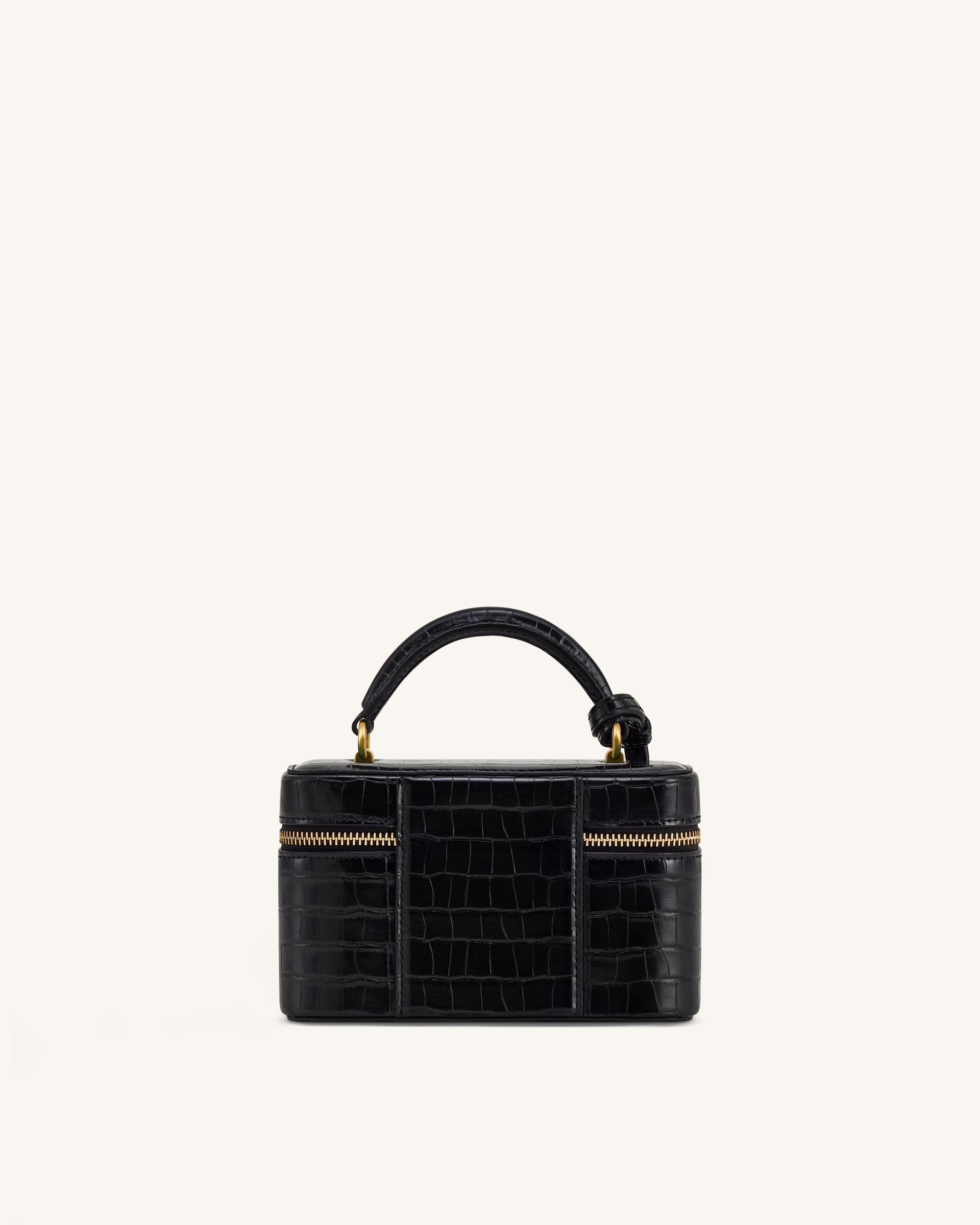 This structured box bag features a croc-embossed finish. The gold-tone hardware complements the black exterior. It comes with a top handle and an adjustable, detachable strap. The interior fits an iPhone 16 Pro Max.