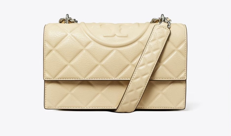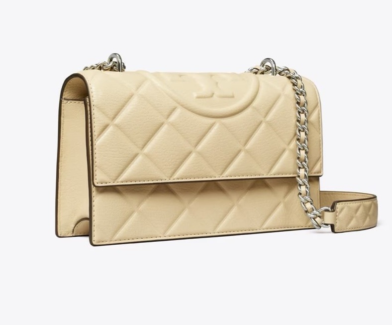 The Fleming Shoulder Bag playfully mixes the scale of diamond debossed quilting on the bag and strap. The adjustable chain, laced with leather, can be worn doubled over the shoulder or long and crossbody.